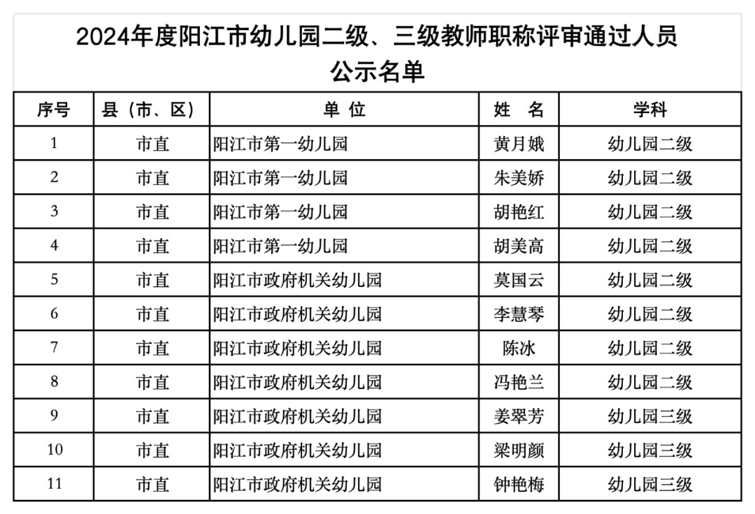 9.2024年度阳江市幼儿园二、三教师职称评审通过人员公示名单