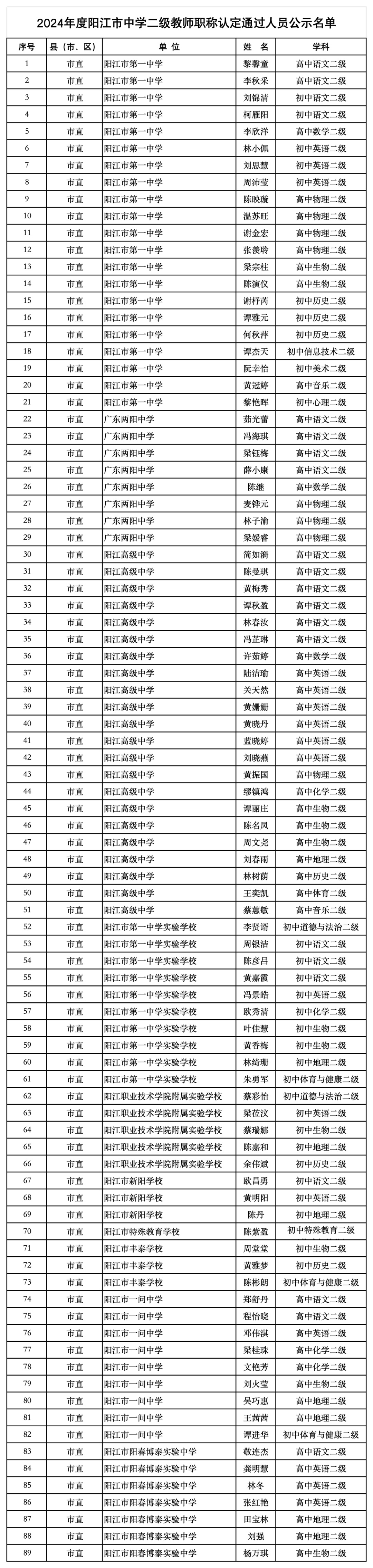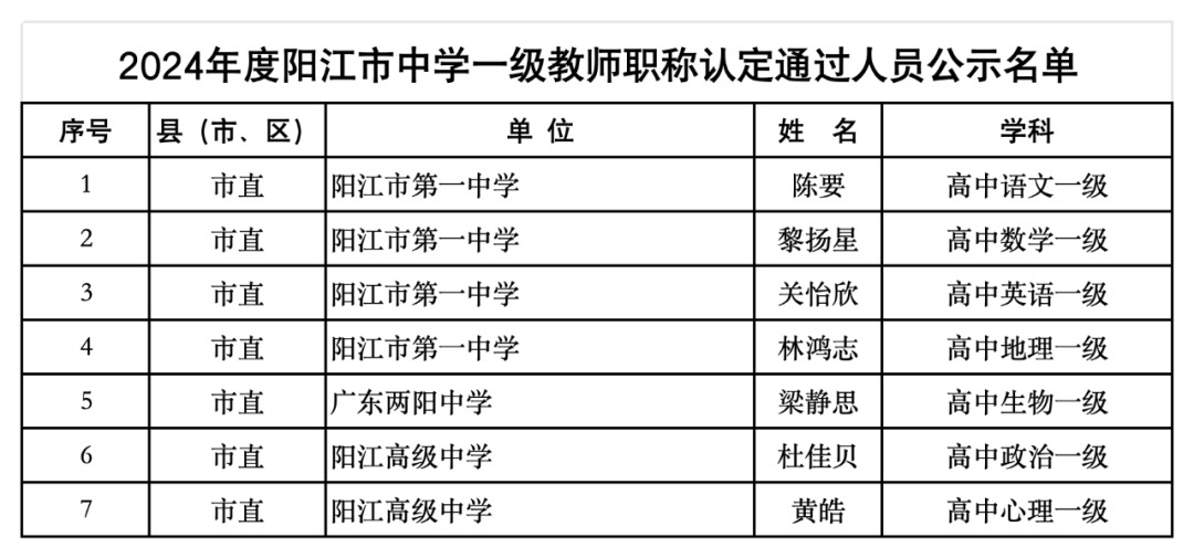 7. 2024年度阳江市中学二级教师职称评审通过人员公示名单