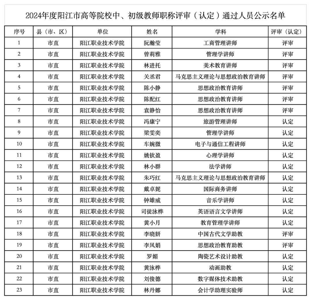 18.2024年度阳江市高等院校中、初级教师职称评审(认定)通过人员公示名单