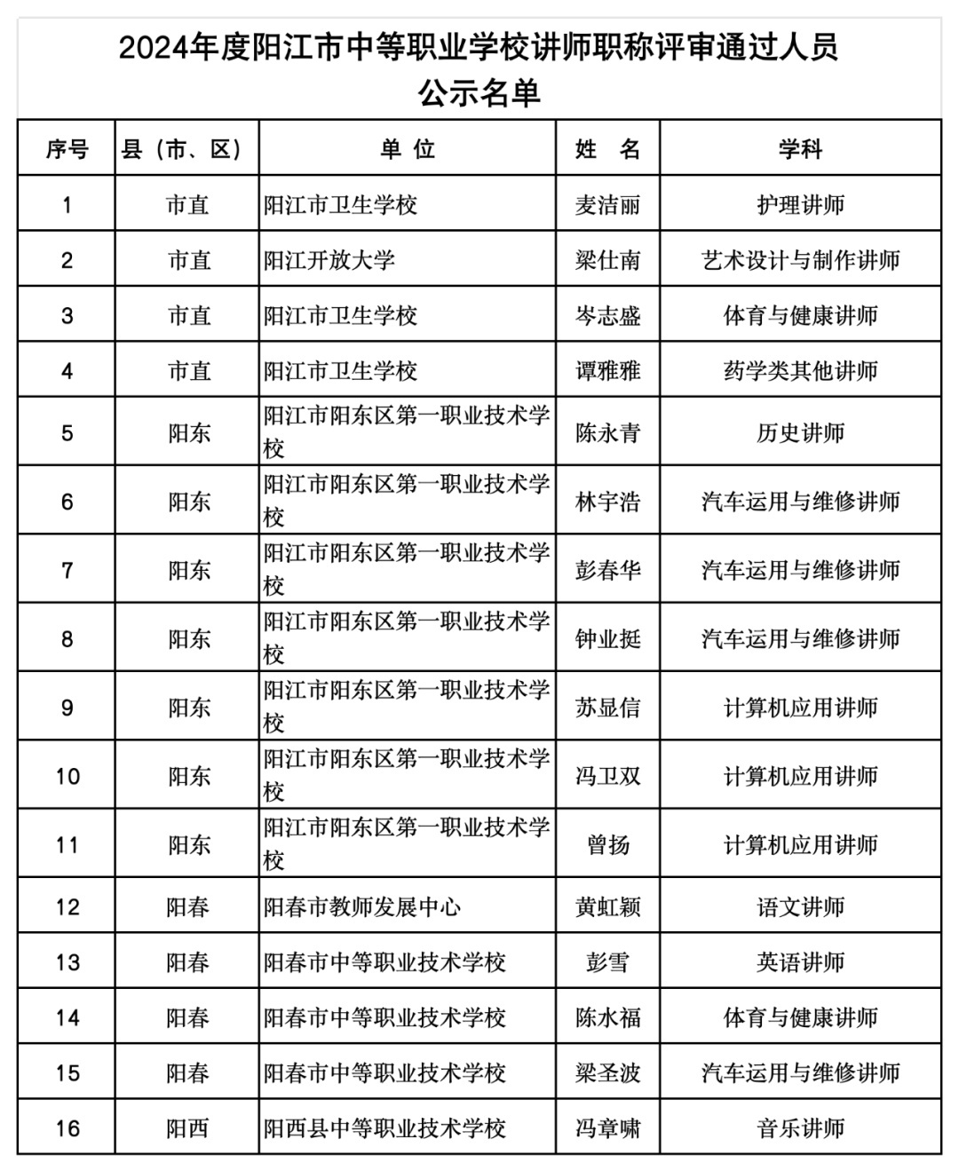 16.2024年度阳江市中等职业学校助理讲师职称评审通过人员公示名单
