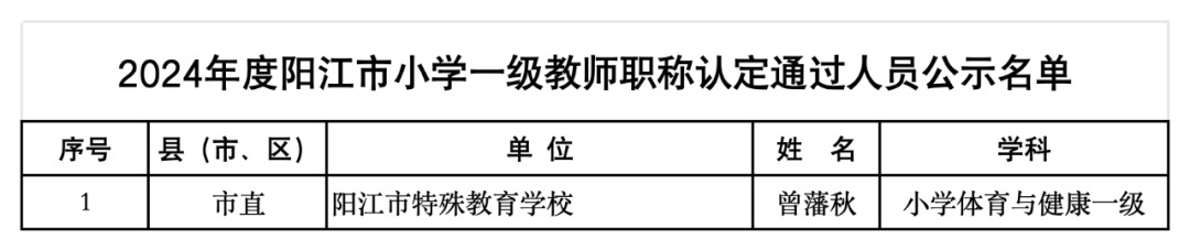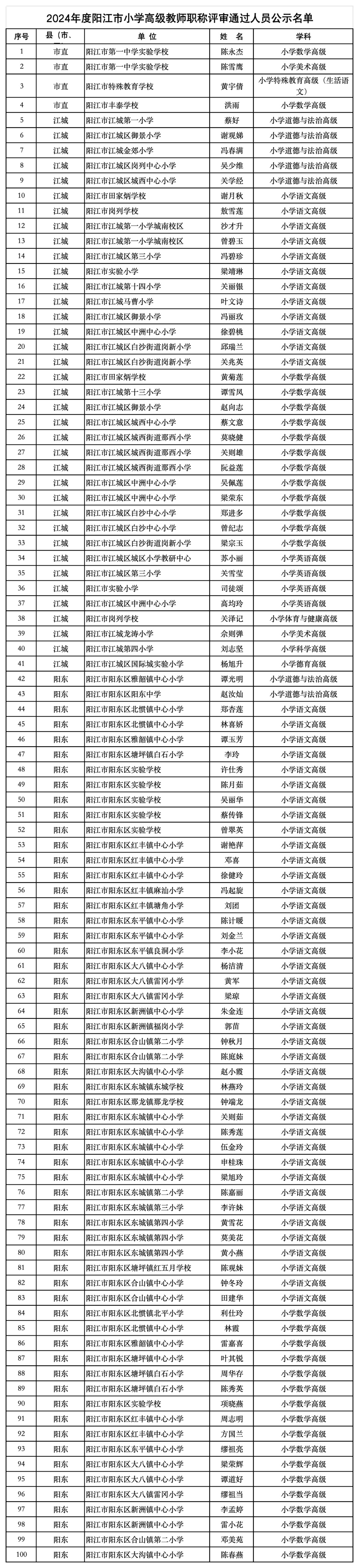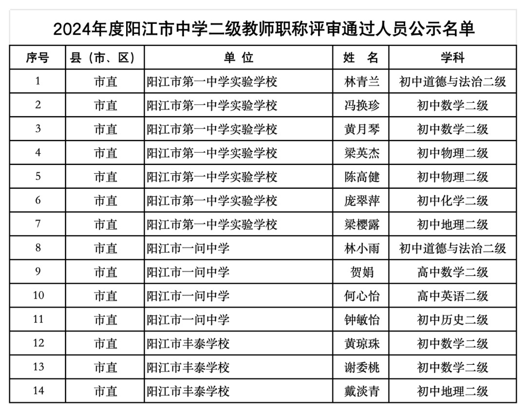 2024年度我市高等院校中、初级职称,中等职业学校、中小学(幼儿园)高级、一级和二、三级教师职称评审委员会评审工作已完成,根据省人力资源社会保障厅《关于印发广东省职称评审管理服务实施办法及配套规定的通知》(粤人社规〔2020〕33号)、《广东省人力资源和社会保障厅 广东省教育厅关于印发<广东省中小学教师职称评审办法> 和 <广东省中小学教师职称评价标准条件> 的通知》(粤人社规〔2022〕30号)、《关于做好2024年度职称评审工作的通知》(粤人社发〔2024〕29号)、《广东省教育厅关于做好2024年度中小学教师职称评审工作的通知》、《广东省教育厅关于做好2024年度中职教师职称评审工作的通知》、《阳江市教育局 阳江市人力资源和社会保障局关于做好2024年度中小学(幼儿园)教师职称评审工作的通知》(阳教人〔2025〕2号)和《阳江市教育局 阳江市人力资源和社会保障局关于做好2024年度中等职业学校教师职称评审工作的通知》(阳教人〔2025〕3号)等文件要求,现对评审通过人员进行公示。