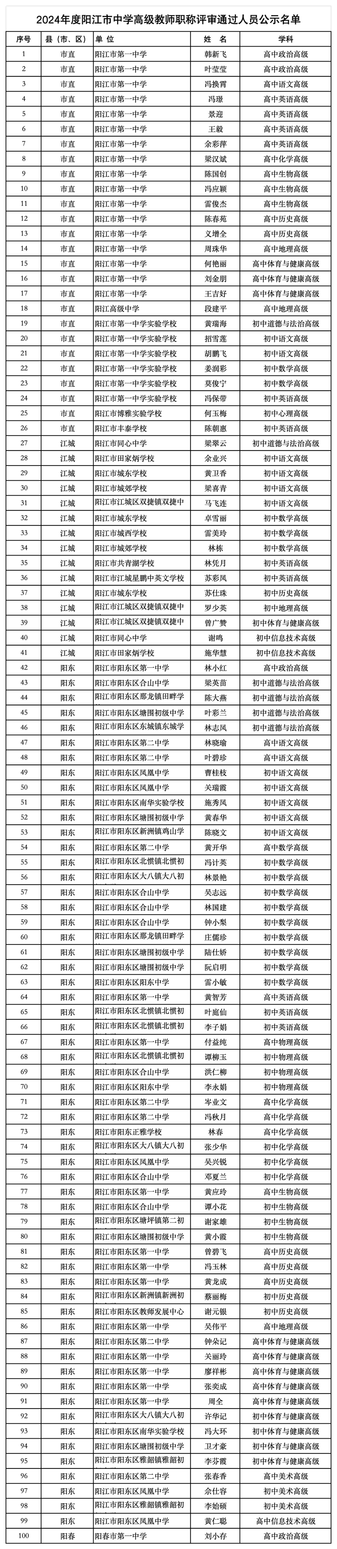 附件:1.2024年度阳江市中学高级教师职称评审通过人员公示名单