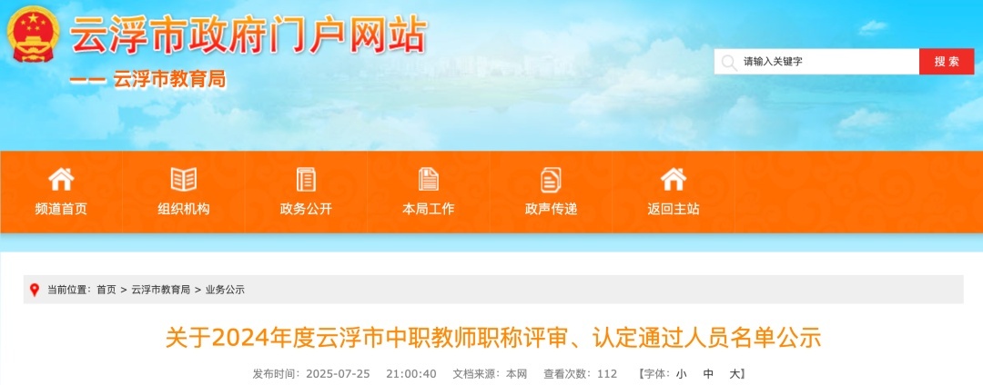 经云浮市中等职业学校教师高级职称评审委员会评审,下列人员通过中职教师职称高、中、初级评审和认定,现予公示。公示时间从2025年7月26日至8月1日止。若对通过人员有异议,请电话或书面形式向市教育局人事科或其所在单位或上级教育主管部门的人事部门或纪检监察部门反映。以个人名义反映的应签署或自报本人真实姓名,并留下联系电话;以单位名义反映的应加盖本单位印章。反映公示对象的情况和问题,应坚持实事求是的原则,不得借机诽谤和诬告。