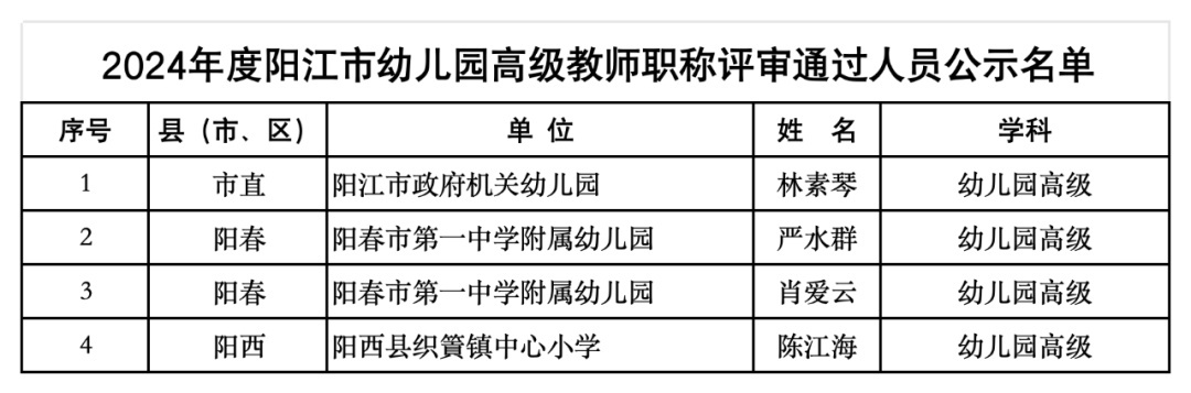 3.2024年度阳江市幼儿园高级教师职称评审通过人员公示名单