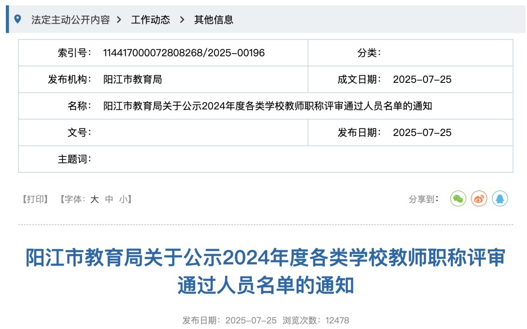 最新消息:阳江公示2024年度各类学校教师职称评审通过人员名单;云浮公示2024年度中职教师职称评审、认定通过人员名单。