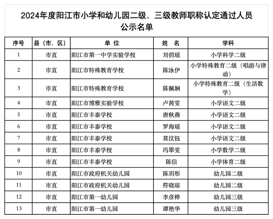 13.2024年度阳江市小学和幼儿园二级、三级教师职称认定通过人员公示名单