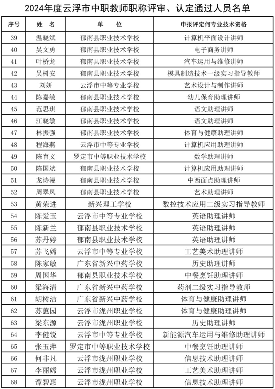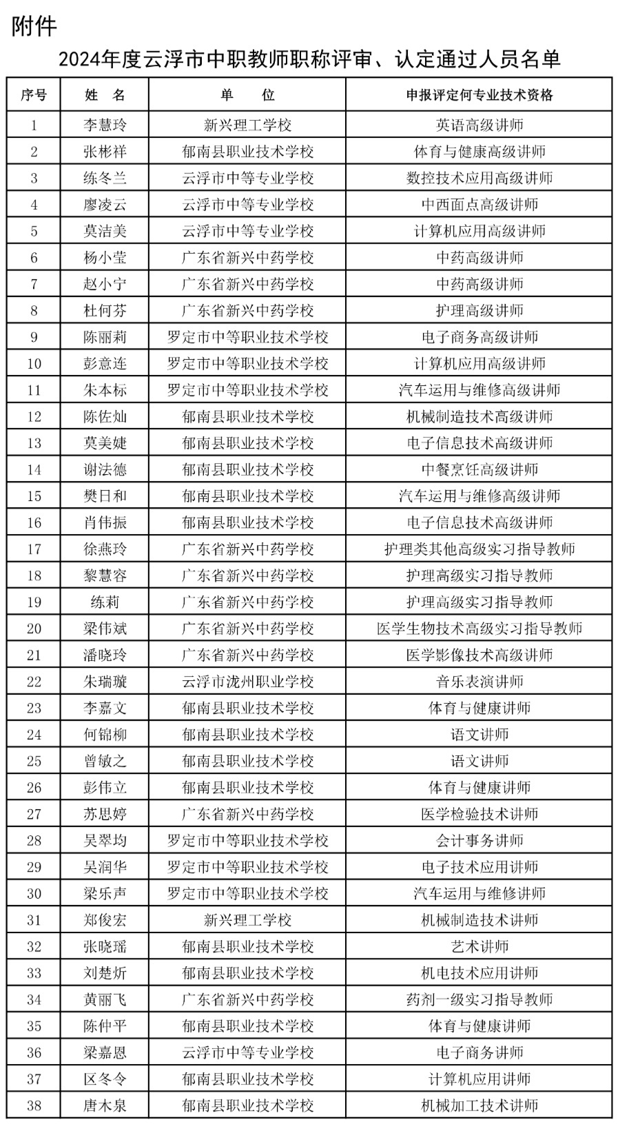 附件:2024年度云浮市中等职业学校教师职称评审、认定通过人员名单