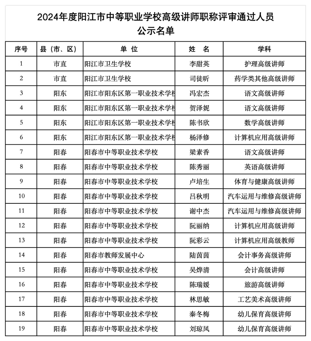 14.2024年度阳江市中等职业学校高级讲师职称评审通过人员公示名单